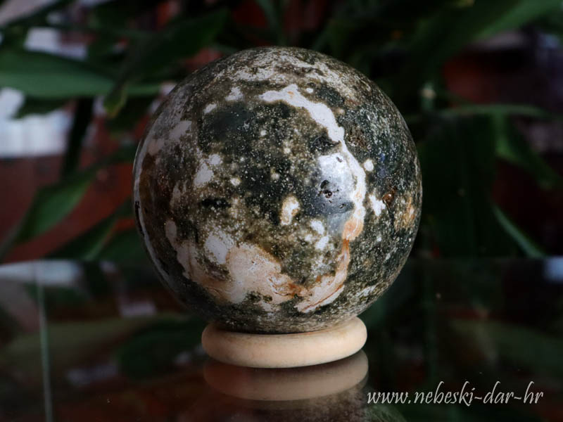 Opis: Vrlo lijepa ručno polirana kugla ocean jaspisa s izraženim orbikularnim uzorkom i malim geodama na površini.