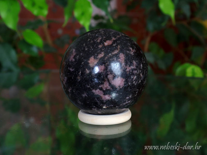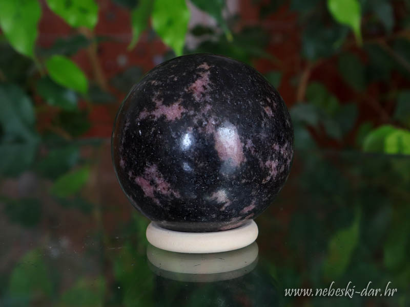 Opis: Ručno polirana kugla rodonita lijepe duboko roze i crne boje, rijedak