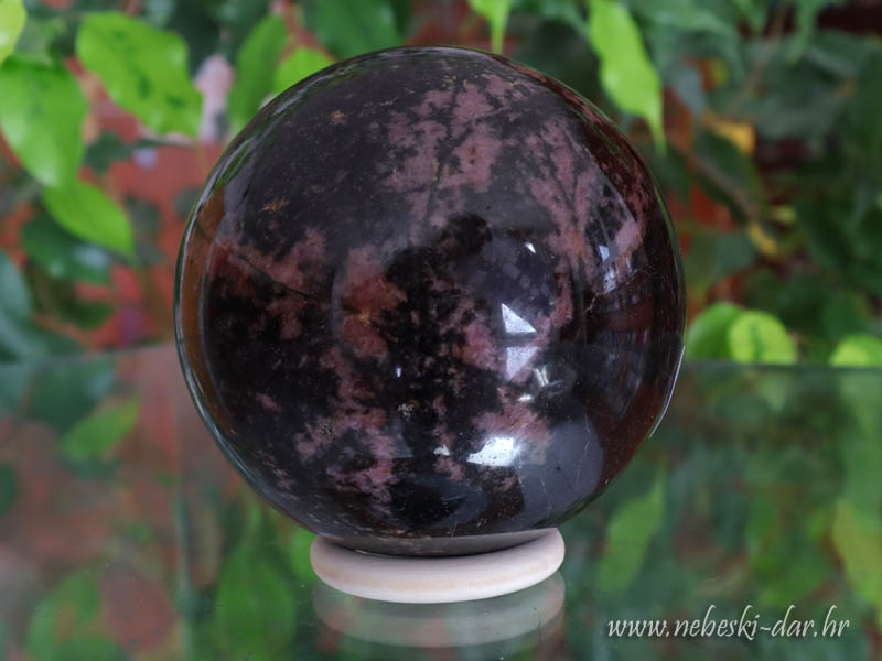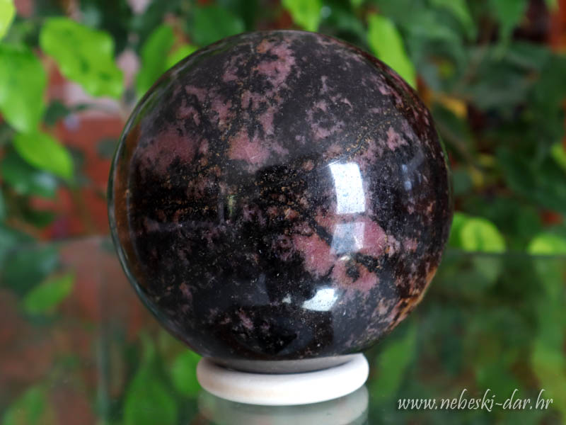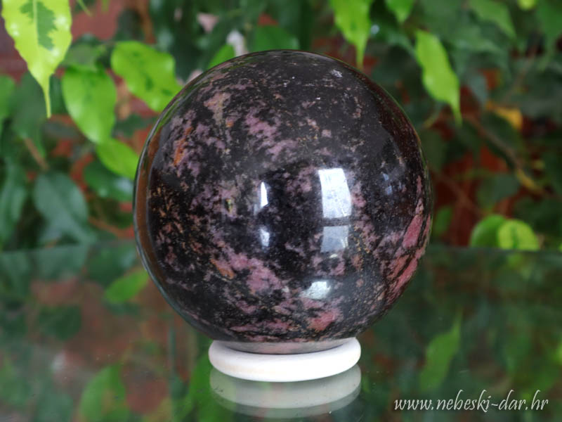 Opis: Ručno polirana velika kugla rodonita lijepe duboko roze i crne boje, rijedak
