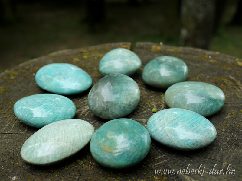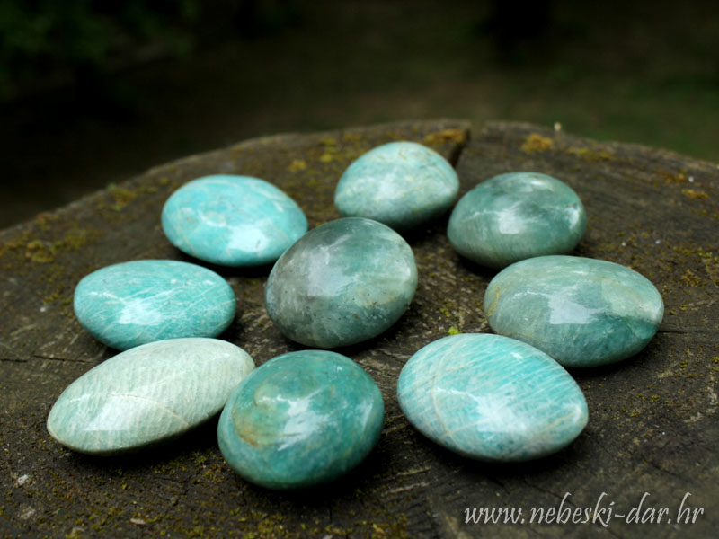 Opis: Vrlo kvalitetni ručno polirani veći obluci amazonita za dlan