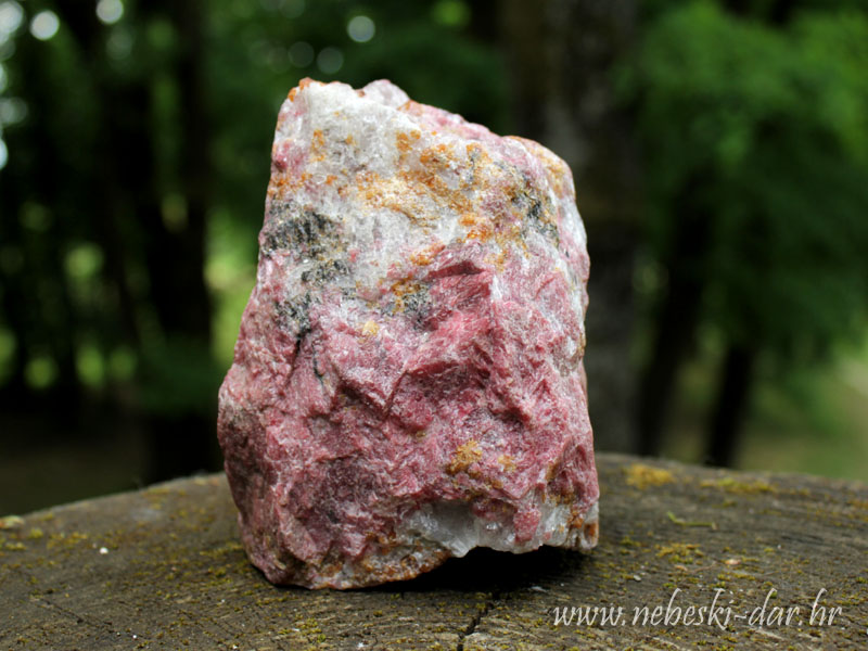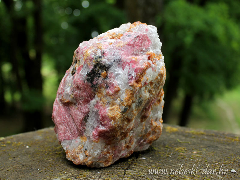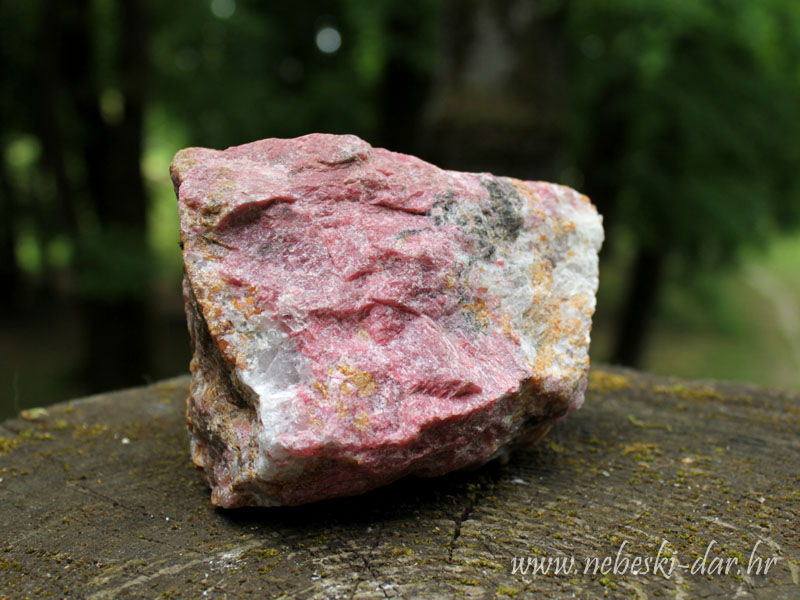 Opis: Prekrasan veliki komad neobrađenog rodonita iz novog nalazišta u Zimbabveu. Boja izražena ružičasta, od tamo ružičaste do svjetlije, sjajne, poput dragulja, što je iznimno rijetko, s crnim dijelovima kromita.