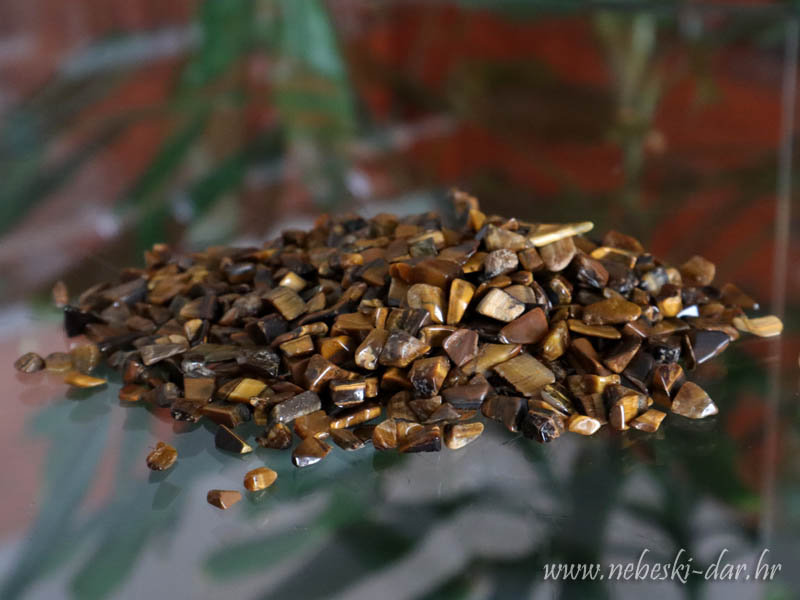 Opis: Polirani komadići tigrovog oka u pakiranjima od 100g, idealno za energiziranje prostora, dekor ili orgonske uređaje