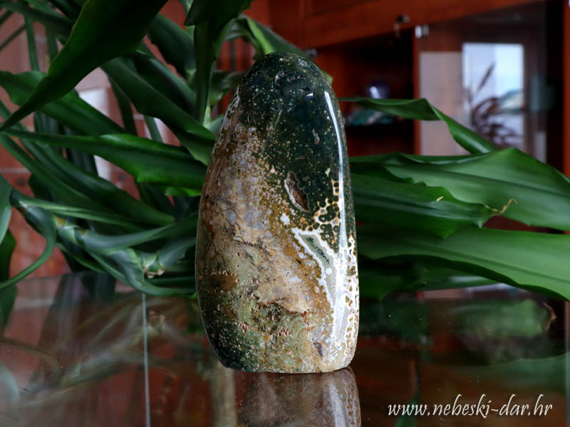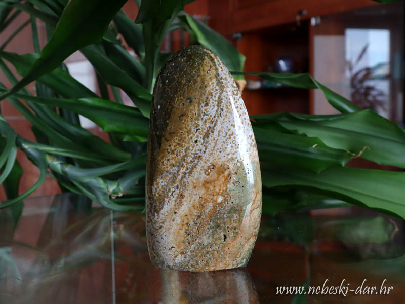 Opis: Samostojeća slobodna forma ručno poliranog ocean jaspisa, izraženi i vrlo lijepi kružni i cvijetni orbikularni uzork - rijedak
