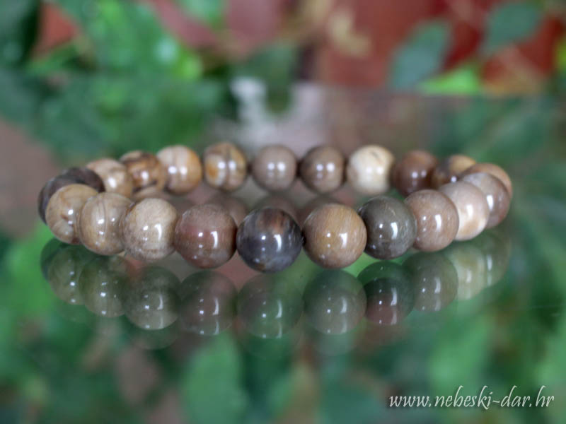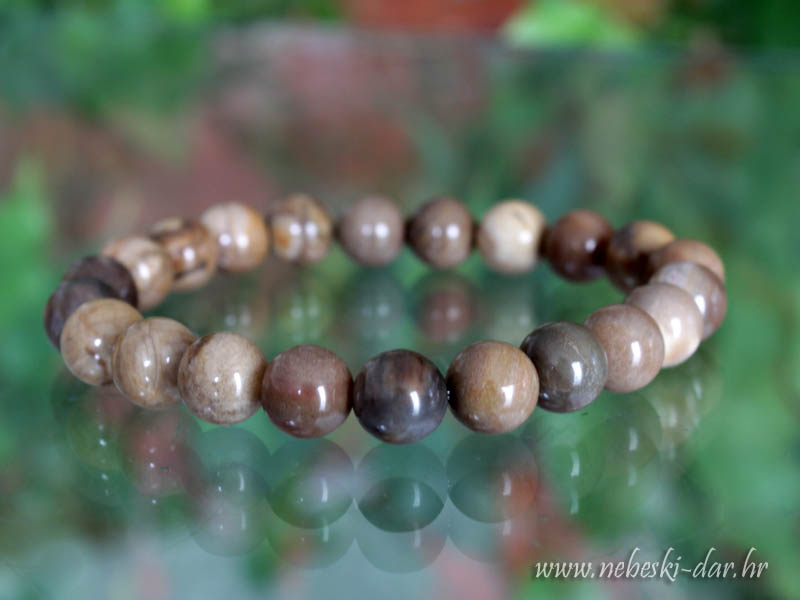 Narukvica od okamenjenog drveta (fosil) nanizanog na elastičnoj vrpci veličine 17,5 cm. Kuglice veličine 8 mm.