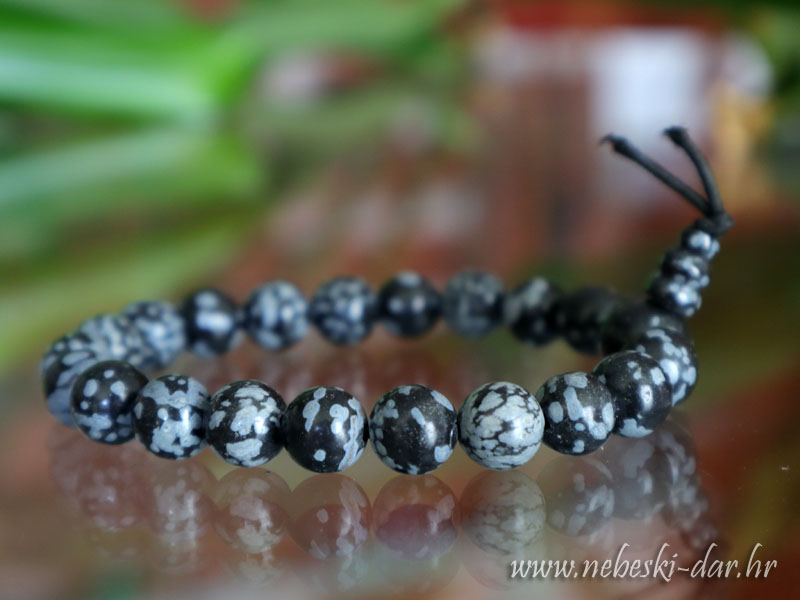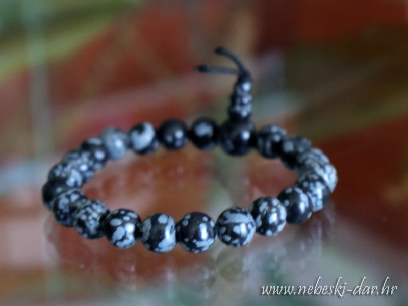 Energetska narukvica (Buddha) od snježnog opsidijana nanizanog na elastičnoj vrpci za nakit veličine 16,5 cm. Kuglice veličine 8mm