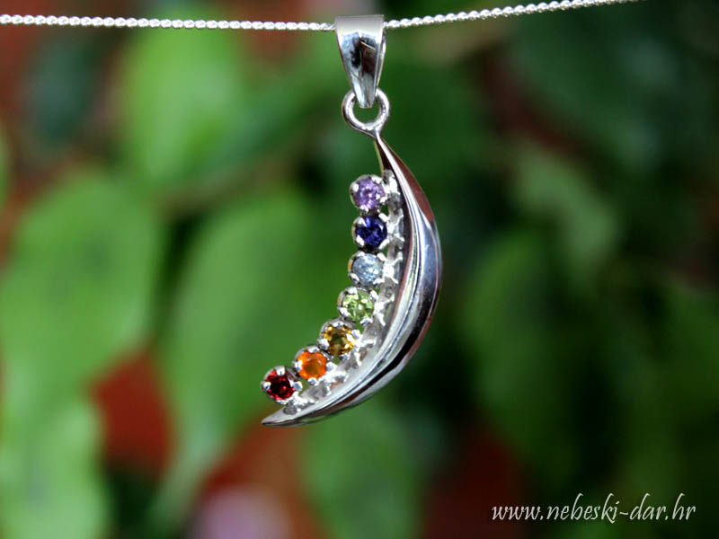 Privjesak čakra mjesec, srebro vrhunske kvalitete. U privjesku je 7 brušenih kristala promjera cca. 3mm: granat, karneol, citrin, peridot, akvamarin, iolit, ametist. Svi kristali su AAA kvalitete.