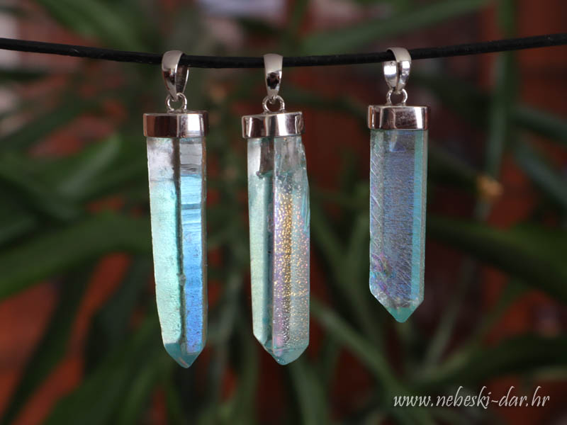Privjesak neobrađene špice Aqua aura kvarca veličine cca. 3,5 - 4,5 x 1 cm sa srebrnom kopčom