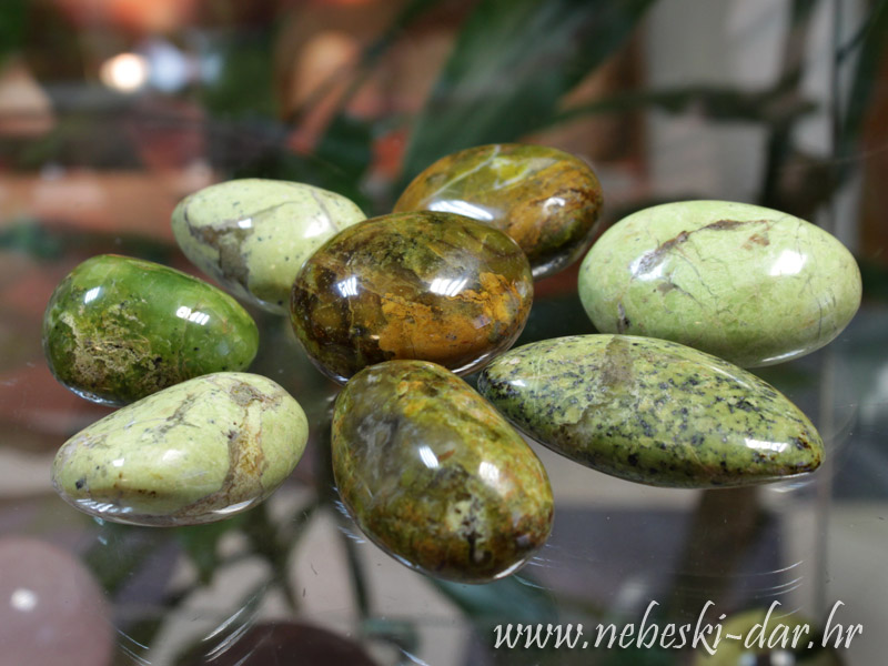 Opis: Rijedak i jedinstven zeleni opal pronađen u malim džepovima na udaljenom području Madagaskara gdje se nalazi u vrlo ograničenim količinama. Oblutci nisu kotrljani već su individualno odabrani i ručno obrađeni. Izražena vrlo lijepa zelena boja s zanimljivim žutosmeđim orbikularnim ili mahovinastim uzorkom.