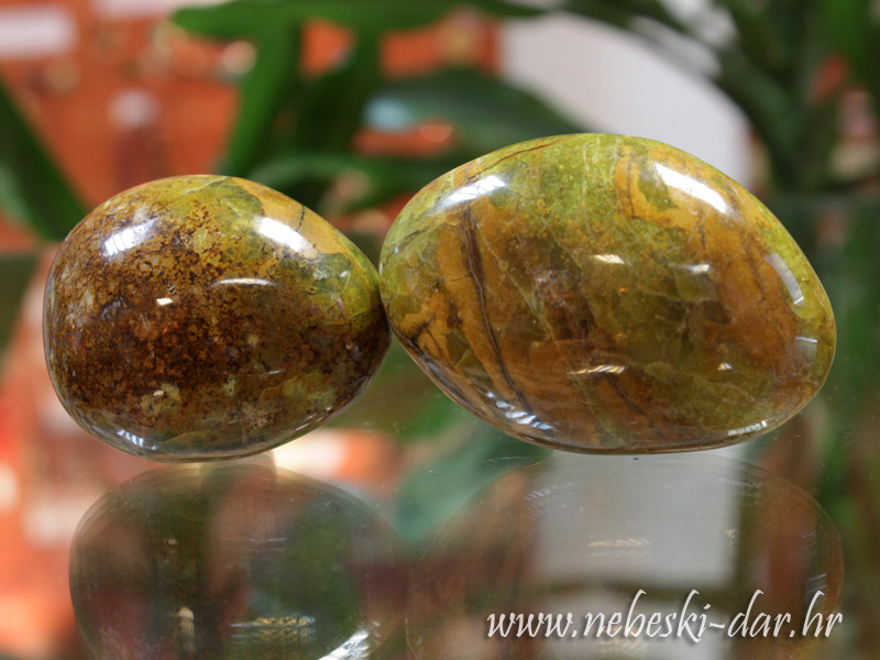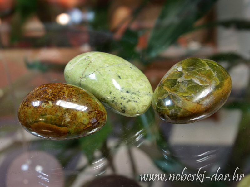 Opis: Rijedak i jedinstven zeleni opal pronađen u malim džepovima na udaljenom području Madagaskara gdje se nalazi u vrlo ograničenim količinama. Oblutci nisu kotrljani već su individualno odabrani i ručno obrađeni. Izražena vrlo lijepa zelena boja s zanimljivim žutosmeđim orbikularnim ili mahovinastim uzorkom.