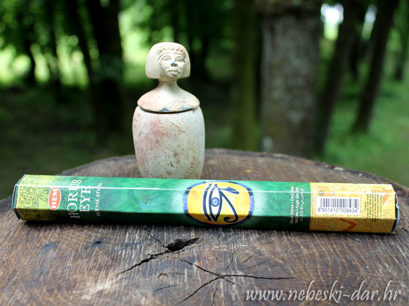 Štapići Horusovo oko vode vas svojim mirisom na vjenčanje faraona. Magični tamjan podupirao je svete ceremonije, dok je Horusovo oko gledalo na sve. Horusovo oko znak zdravlja, zaštite i kraljevske vlasti. a nošen je kao amulet protiv „zla oka”.