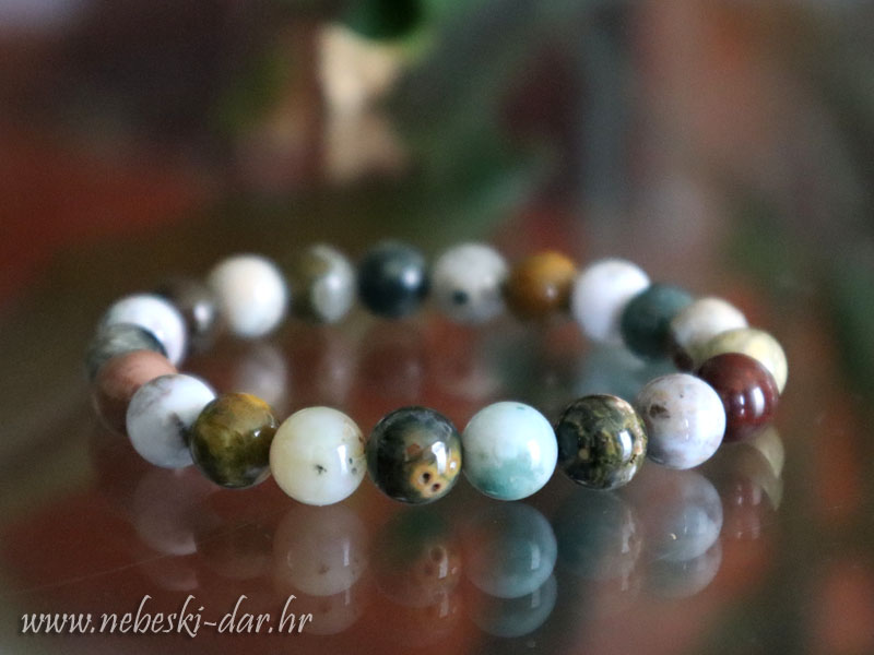 Narukvica ocean jaspisa nanizanog na elastičnoj vrpci za nakit dužine cca. 17cm. Kuglice su veličine cca. 7-9 mm.