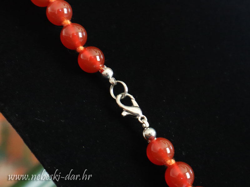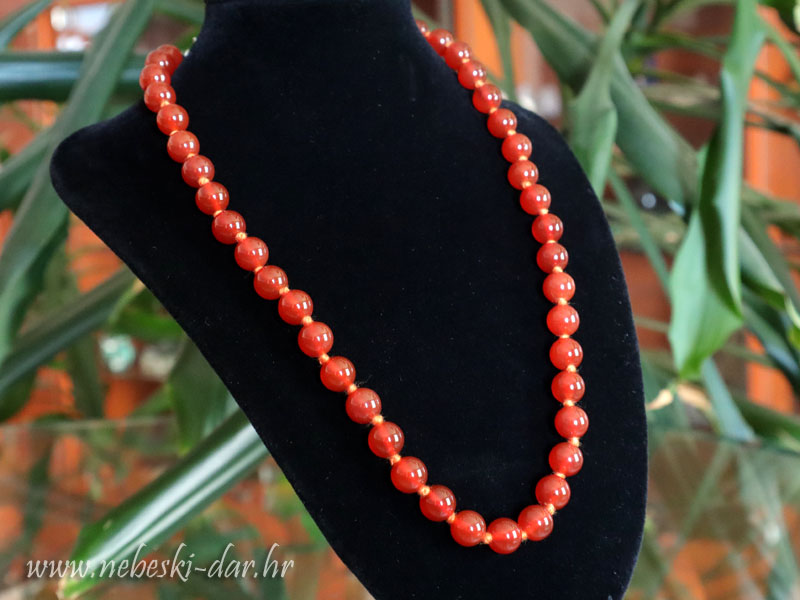 Ogrlica od karneola s metalnom kopčom. Dužina ogrlice cca. 45 cm. Veličina kristala cca. 8 mm.