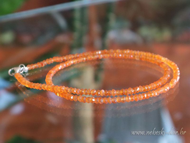 Ogrlica od facetiranog karneola sa srebrnom kopčom. Dužina ogrlice cca. 45 cm. Veličina kristala cca. 3 mm.